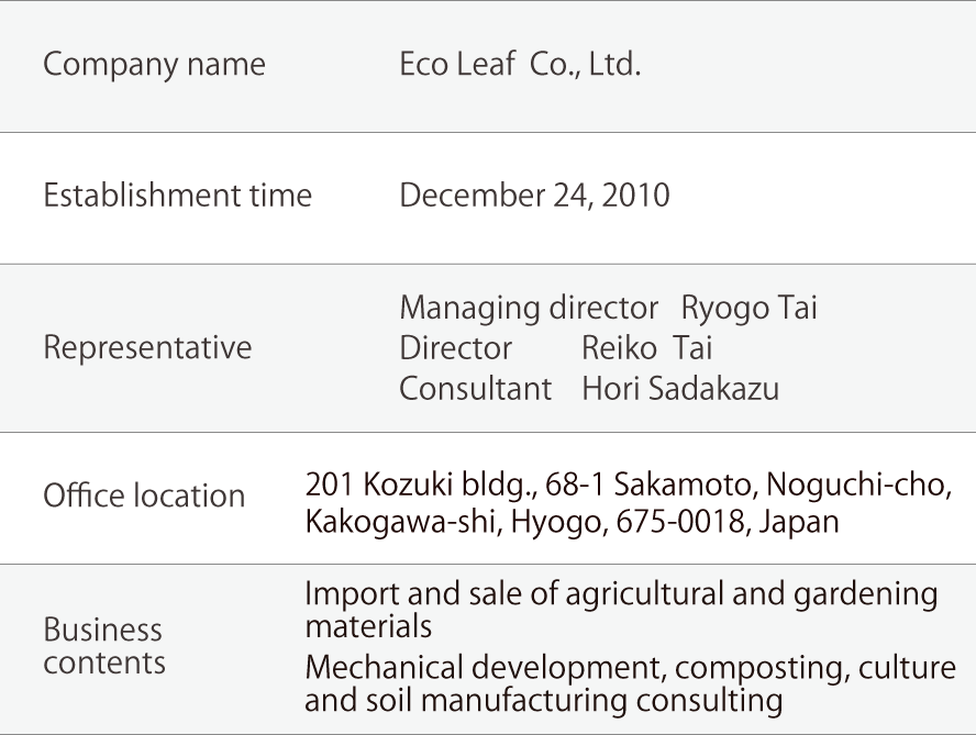 Eco-Leaf Co. & Ltd. is an import trade company of agricultural and gardening materials industrialized in Kobe, Japan. First of all, we would like to tell you that the factory in oversea producing several kind of leaf mold is designed by our counselor by visiting the factory many times. We therefor are very proud of the factory as the top among the industry from the view point of quality of goods and its production capacity. This factory is kept always clean and neat like any factory in Japan, and our customers can enjoy the quality of our products without any uneasiness in mind. Secondly, we like to tell you that we are in a position to solve your troubles or worries including your factory’s machineries. We are now settled in Kakogawa-city which is the native town for both our counselor and myself. What we have in mind is how we can make contributions to our society and keep efforts day after day.It will be our pressure if we can get any approach from you, and we remain,